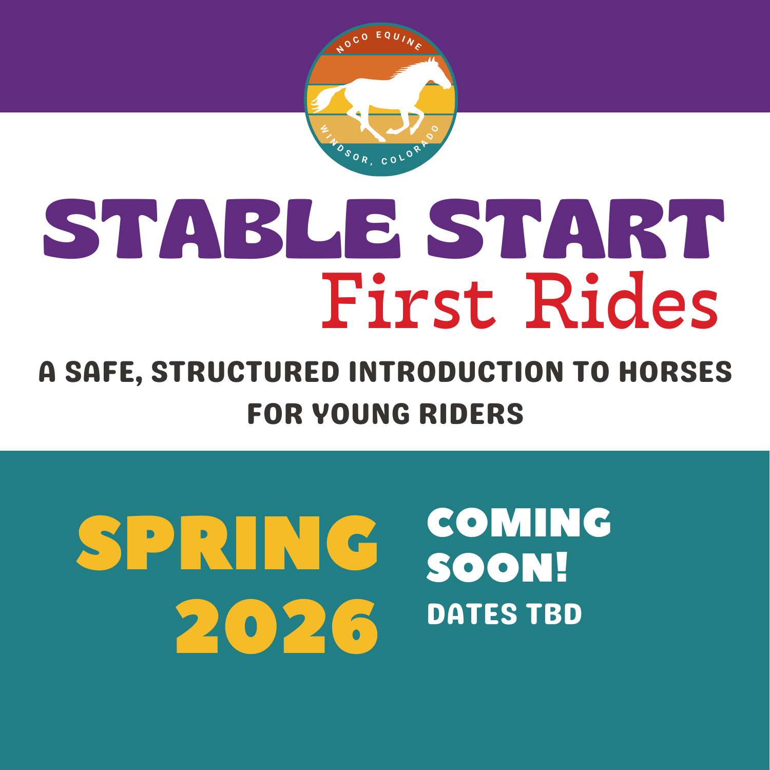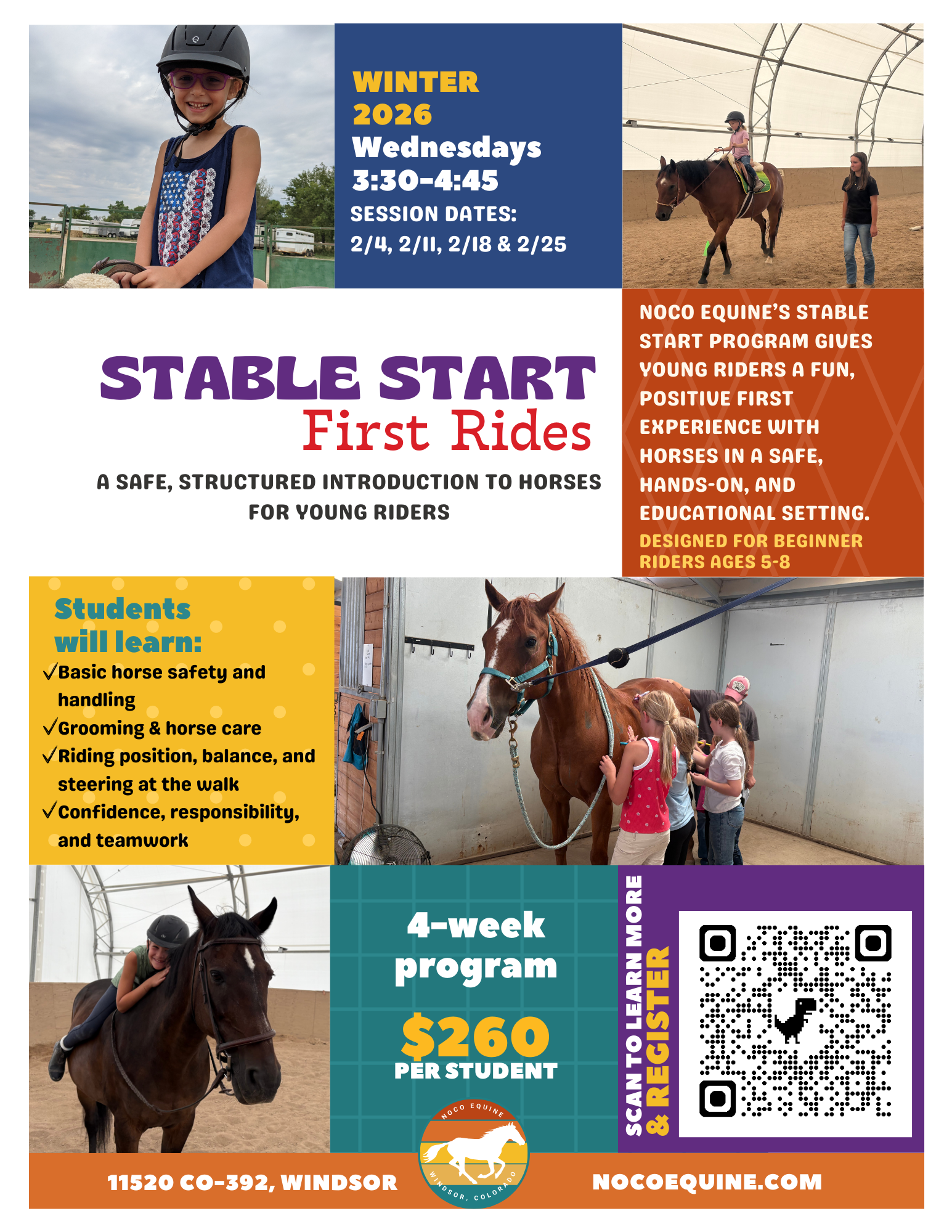 Stable Start is NOCO Equine’s beginner horseback riding program for young riders. This beginner-friendly, 4-week program, focuses on building confidence, safety awareness, foundational horsemanship skills, and first rides at an age-appropriate pace.