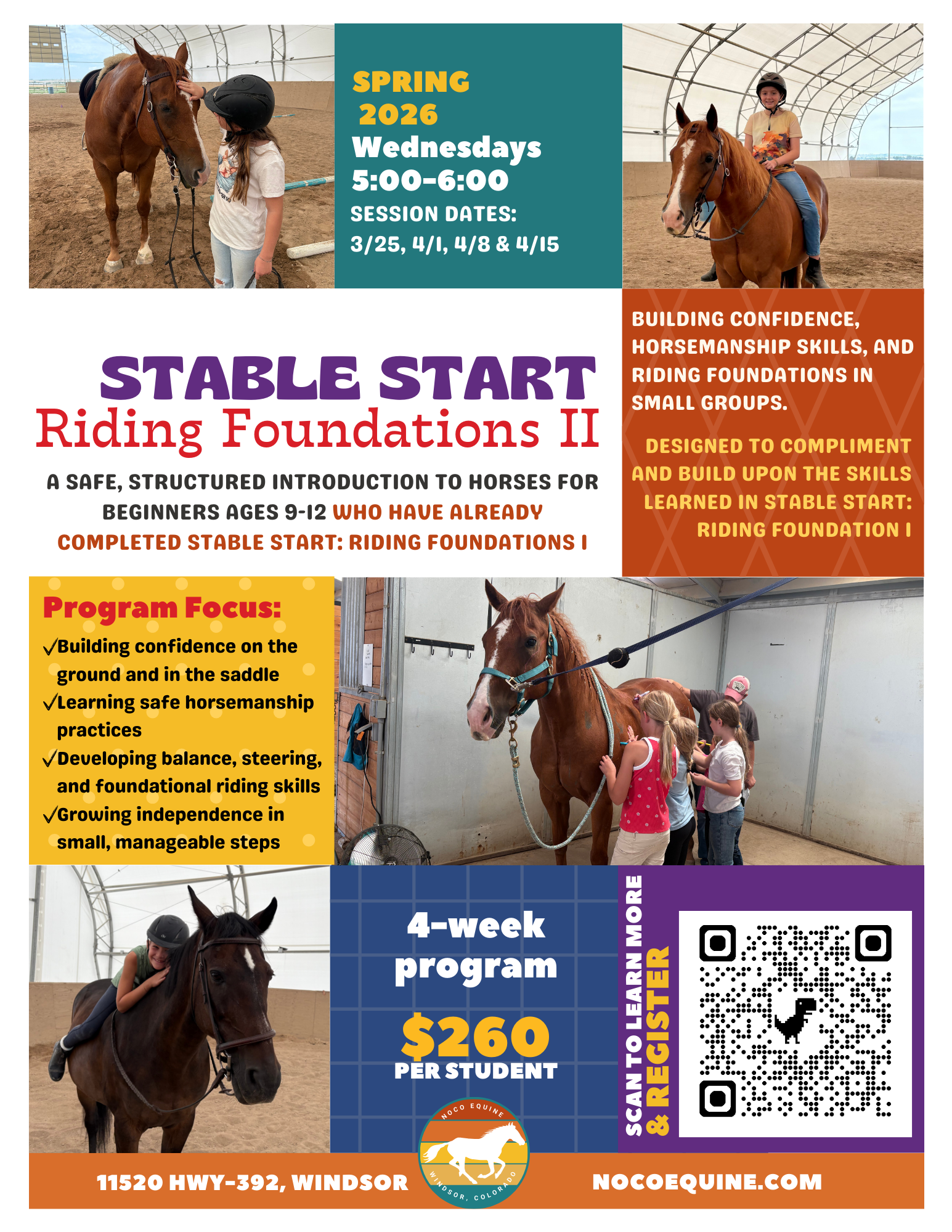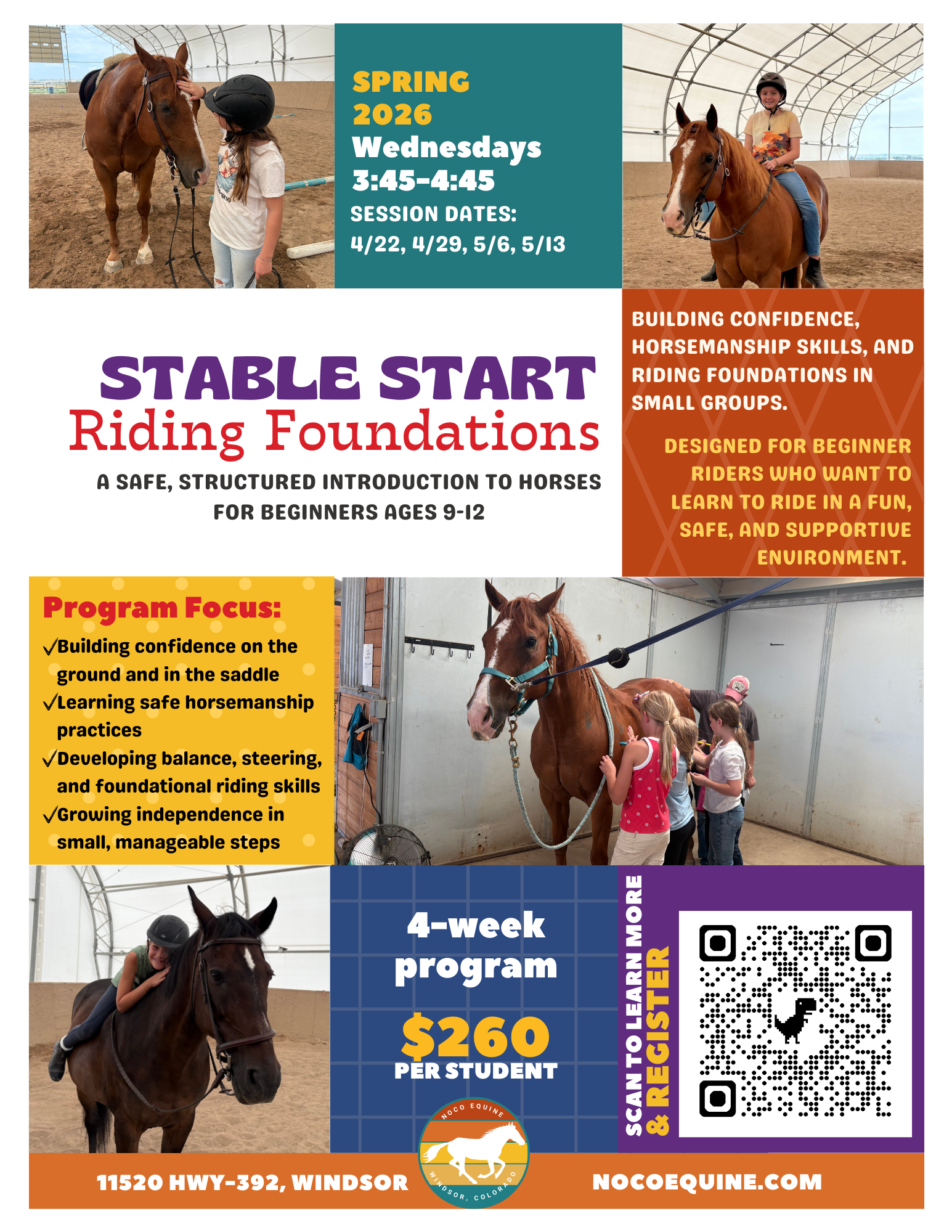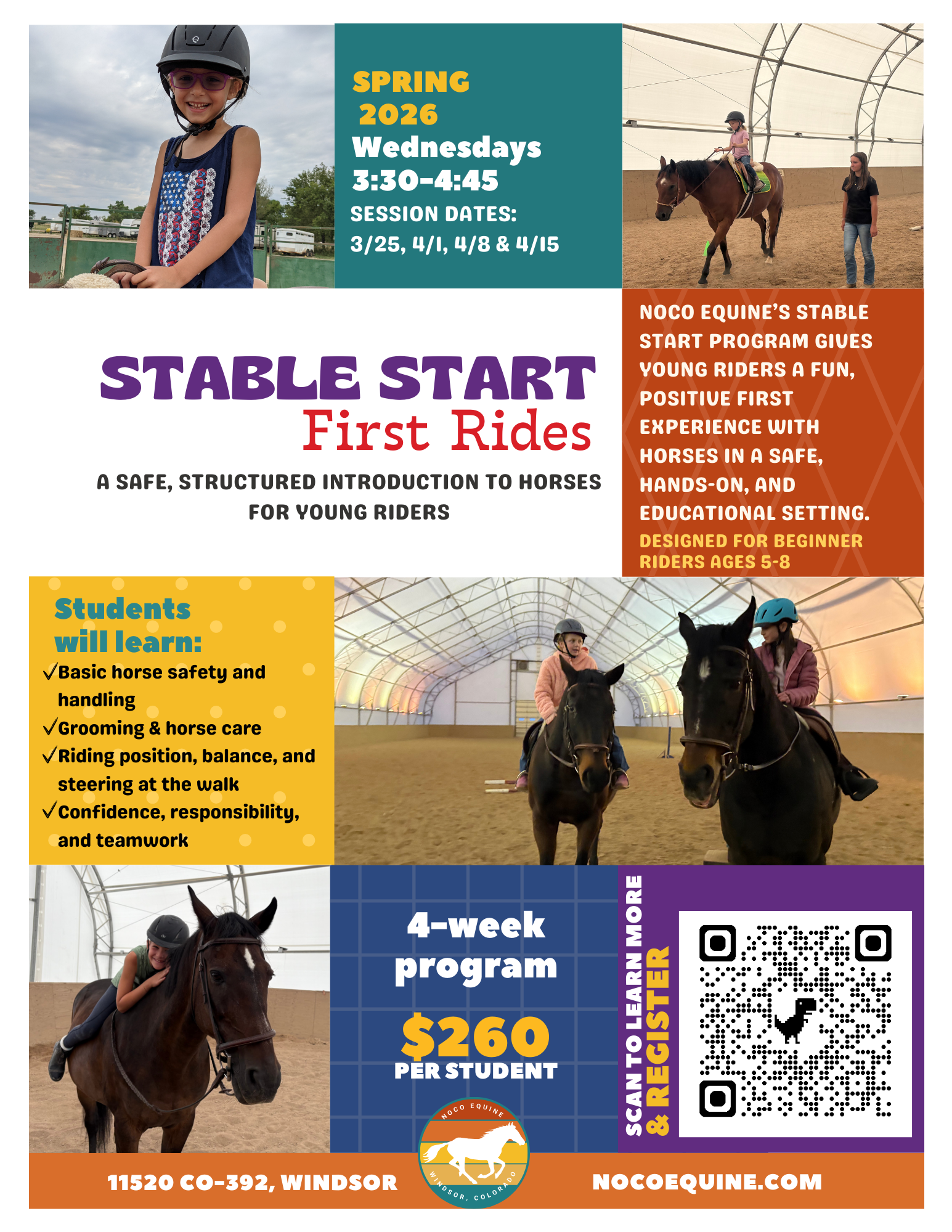 Stable Start is NOCO Equine’s beginner horseback riding program for kids, thoughtfully designed to introduce young riders to horses in a safe, confidence-building, and age-appropriate way.